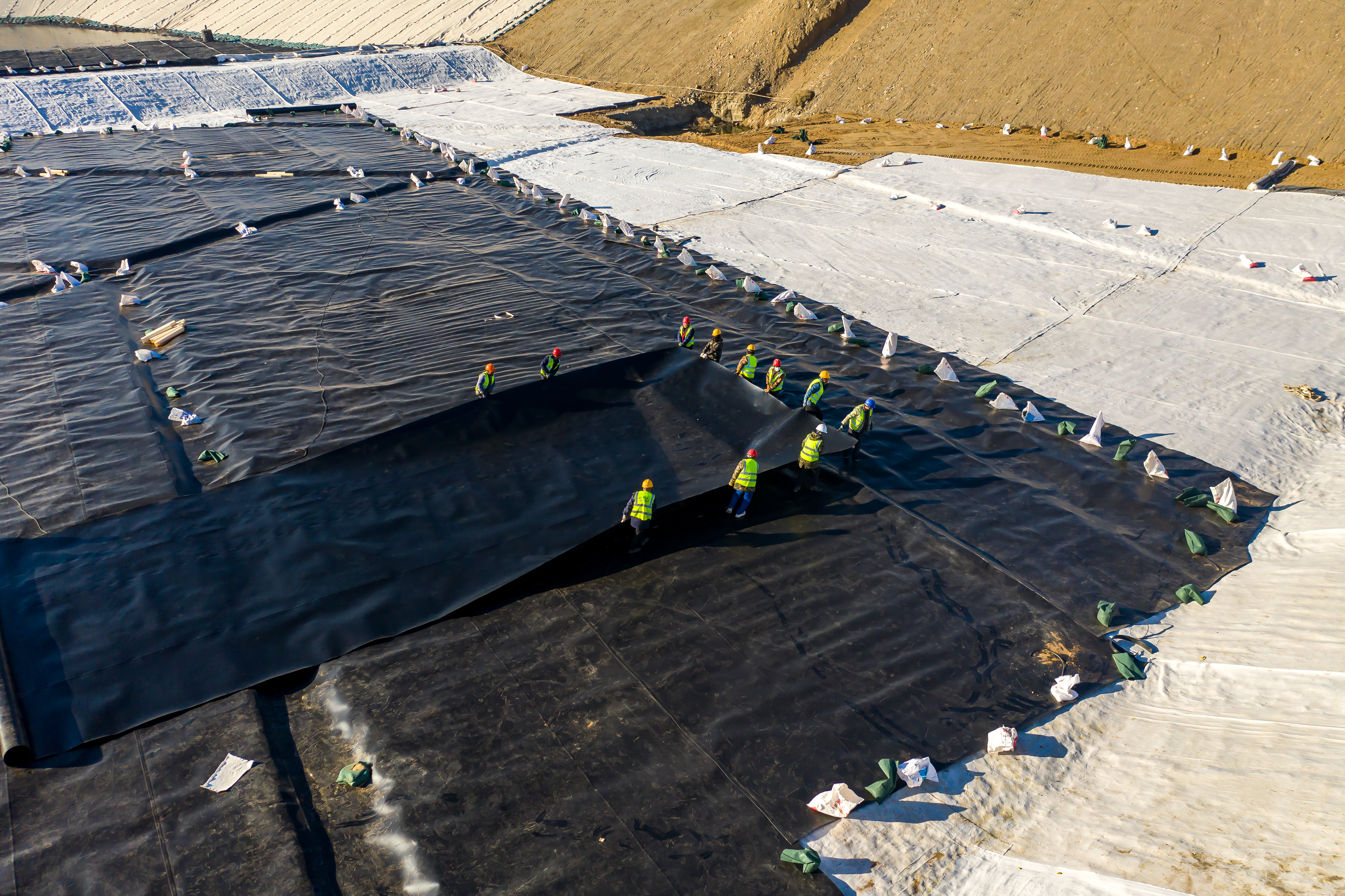 北風(fēng)呼嘯,烏海垃圾處理新建工程項目部下足“繡花功夫”,給垃圾消納場(chǎng)披上高韌性的黑色“斗篷”,一面在兩層長(cháng)50米,寬8米,厚2毫米的HDPE防滲膜之間填充高強度的網(wǎng)格作為支撐,保證防滲效果,讓滲濾液能夠按照既定軌道輸送到排水盲溝后再進(jìn)行降排降污處理;一面在HDPE防滲膜表面覆蓋石子導流層和土工濾網(wǎng),以實(shí)現垃圾儲存和滲濾液運輸兩者的分離,防滲層猶如裝上雙重密封保險。