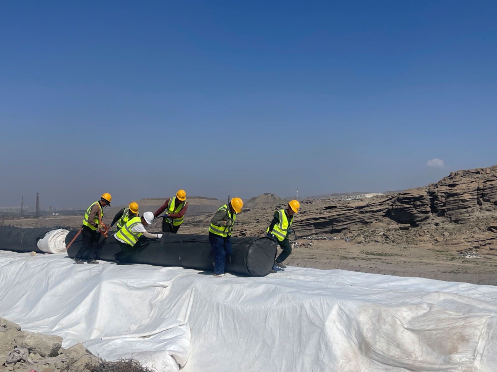 入秋以來(lái),本就常年大風(fēng)的烏海市海渤灣區,接連刮起五六級強風(fēng),氣溫驟然下降,但卻絲毫不減施工現場(chǎng)的“火熱”。一輛輛挖掘機、運輸車(chē)在大風(fēng)和黃沙間穿行,機械設備轟鳴運轉,6名施工人員正拉拽一卷8米寬的防水卷材徐徐向前。“垃圾消納場(chǎng)地表需要鋪設這種特制防水膜,每卷重量達1.3噸,由于吊車(chē)不能駛入防水層,材料運抵后只能肩挑人扛入場(chǎng)。”烏海項目部安質(zhì)環(huán)部負責人李宗宣說(shuō)道。