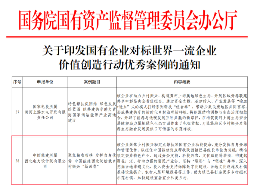 news近日,國務(wù)院國資委印發(fā)《國有企業(yè)對標世界一流企業(yè)價(jià)值創(chuàng )造行動(dòng)優(yōu)秀案例》,評選出6個(gè)重點(diǎn)領(lǐng)域,共計40個(gè)代表性強、創(chuàng )新性突出、推廣價(jià)值高的優(yōu)秀案例。中國能建所屬西北電力設計院有限公司(以下簡(jiǎn)稱(chēng)西北院)選送的《聚焦精準幫扶 發(fā)揮自身優(yōu)勢 中國能建西北院繪就鄉村振興“新畫(huà)卷”》成功入選推動(dòng)共建共享領(lǐng)域的優(yōu)秀案例。