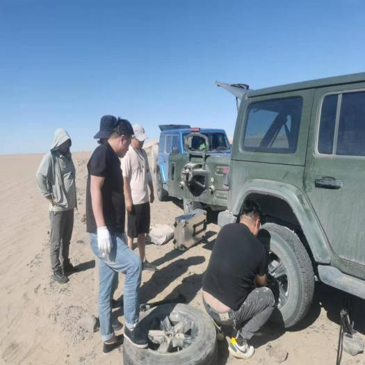 當隊員們剛“收拾”好自己的身體之后,就要馬不停蹄地趕往項目現場(chǎng),勘探選址的腳步一刻也不能放緩。抵達現場(chǎng)之后,頂著(zhù)令人窒息的頭痛強行推進(jìn)已是常態(tài),車(chē)輪深陷于無(wú)情的戈壁,隊員們不得不頂著(zhù)劇烈頭痛和發(fā)軟的雙腿,在滾燙灼人烈日下的荒灘上徒步跋涉,奮力推車(chē)、尋找穩固路基。